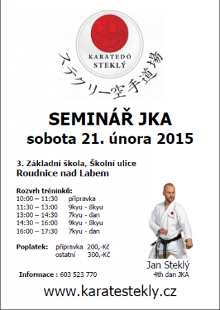 Dne 2.5. 2015 pořádal Sensei Steklý seminář v Děčíně, který trávit studiem karate skoro celý duben přímo v Japonsku v HQ dojo u top učitelů. Jako vždy se jednalo o jedinečnou akci.