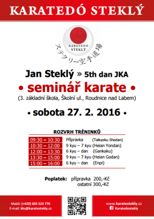 Dne 27.2.2016 se konal seminář, který vedl sensei Steklý 5.dan JKA, zaměření bylo na kata Gankaku a Enpi.